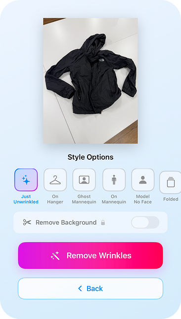 Our advanced AI analyzes the fabric texture in your photo and digitally "irons" out creases, folds, and wrinkles while preserving the natural look of the garment. It's the fastest way to prep clothes for sale without a steamer.